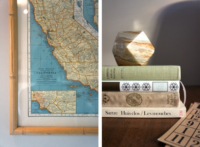 Resources: Bassett side table from Midcentury Mobler; stump side table from West Elm; rattan tray from Crate & Barrel; sheepskins from IKEA; Danish wall hanging from Project Sarafan; midcentury ceramic lamp from Loverly Vintage; kilim pillow cover from Sukan; onyx-marble polyhedron from Sky Parlor; cacti screenprint from Banquet Atelier; bud vase from Heath Ceramics